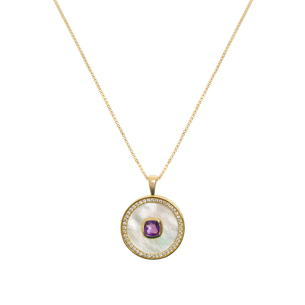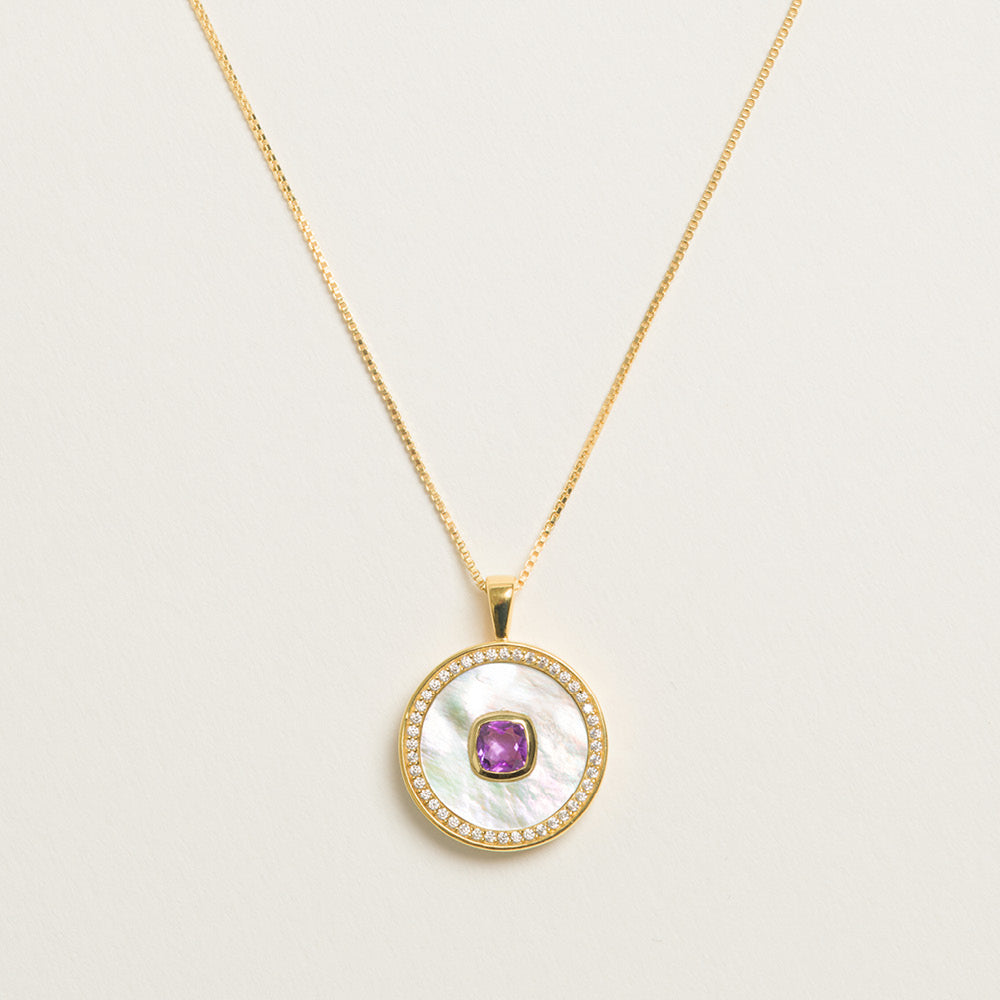 Our Amethyst Mother of Pearl Necklace features an eye-catching violet amethyst set into Mother of Pearl, surrounded by dainty White Zircon stones and crafted in 18ct gold vermeil over sterling silver. Created in celebration of February birthdays, amethyst is linked to calm and clarity. This necklace offers a personal way to mark a meaningful date with a refined design perfect for daily wear and special occasions alike.